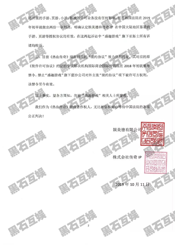 针对2019年10月10日,“盛趣游戏”相关人士散布的“娱美德败诉”这一误导公众的信息,株式会社传奇IP(2017年5月23日前为娱美德有限公司)作为《Legend of MIR2》(中文版名称为《传奇》或《热血传奇》)的著作权共有人)为此郑重声明如下;